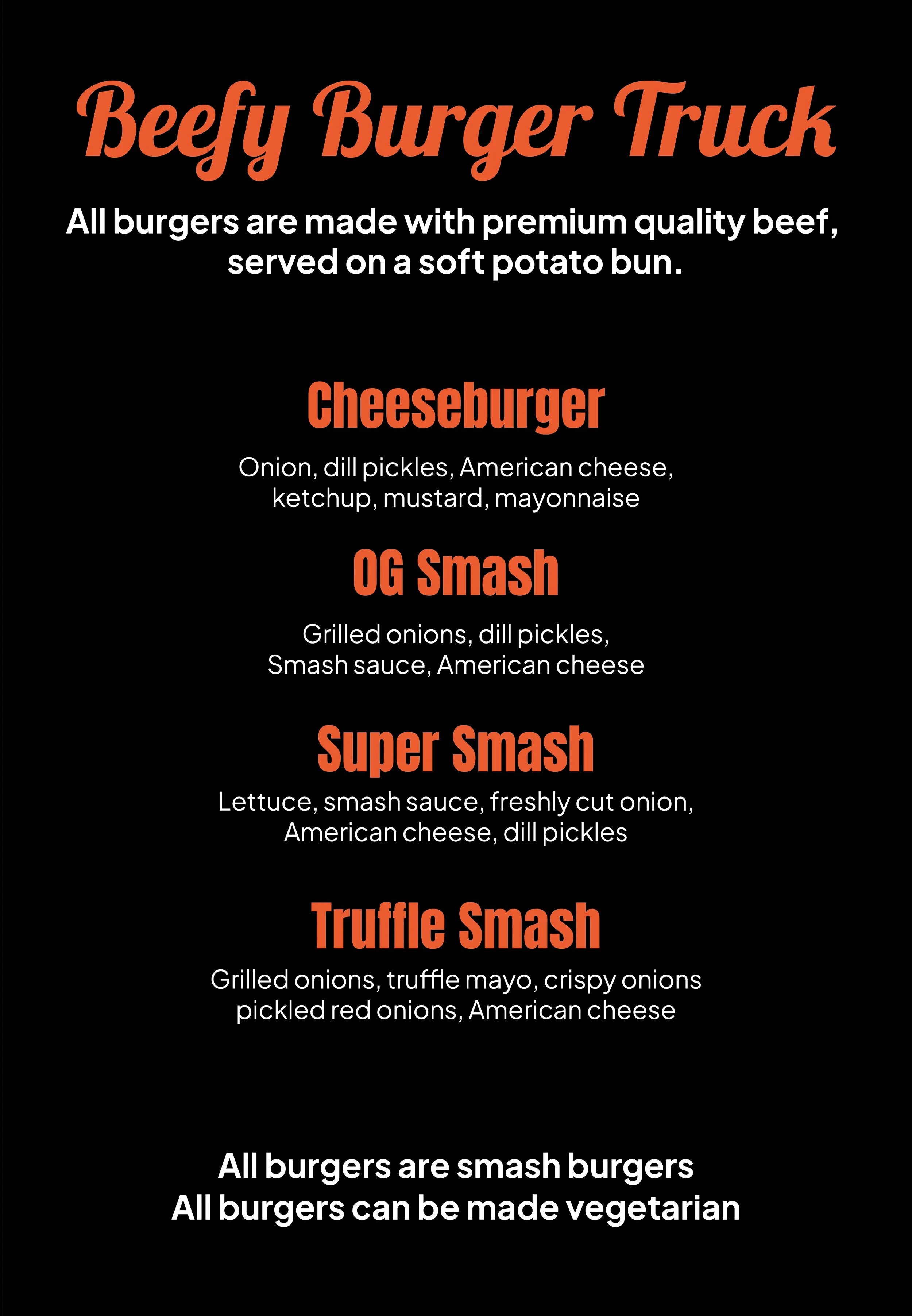 Hos Beefy Burger handler det om smagfulde og saftige smashburgere. Det er det vi serverer: enkelt, ærligt og altid lavet med kærlighed.
